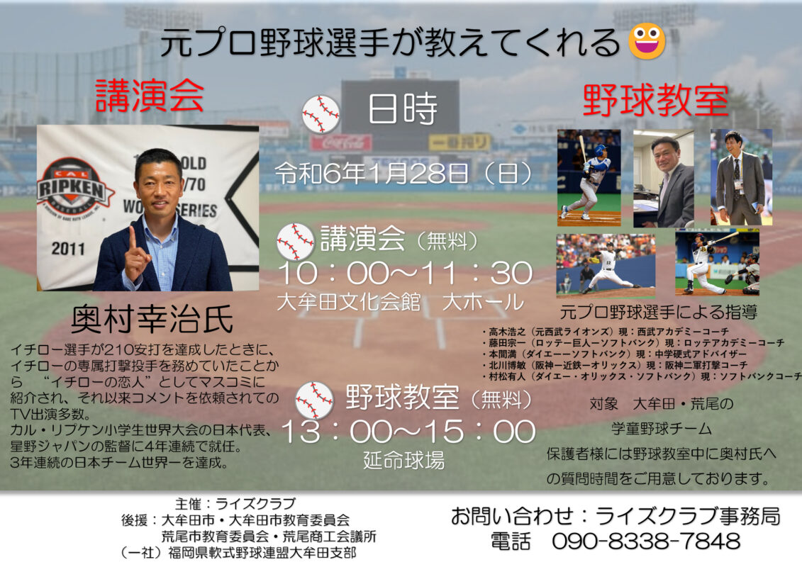 このたび、私どもは1/28(土)におきまして、”元プロ野球選手が指導する野球教室/後援会”を開催することとなりました。